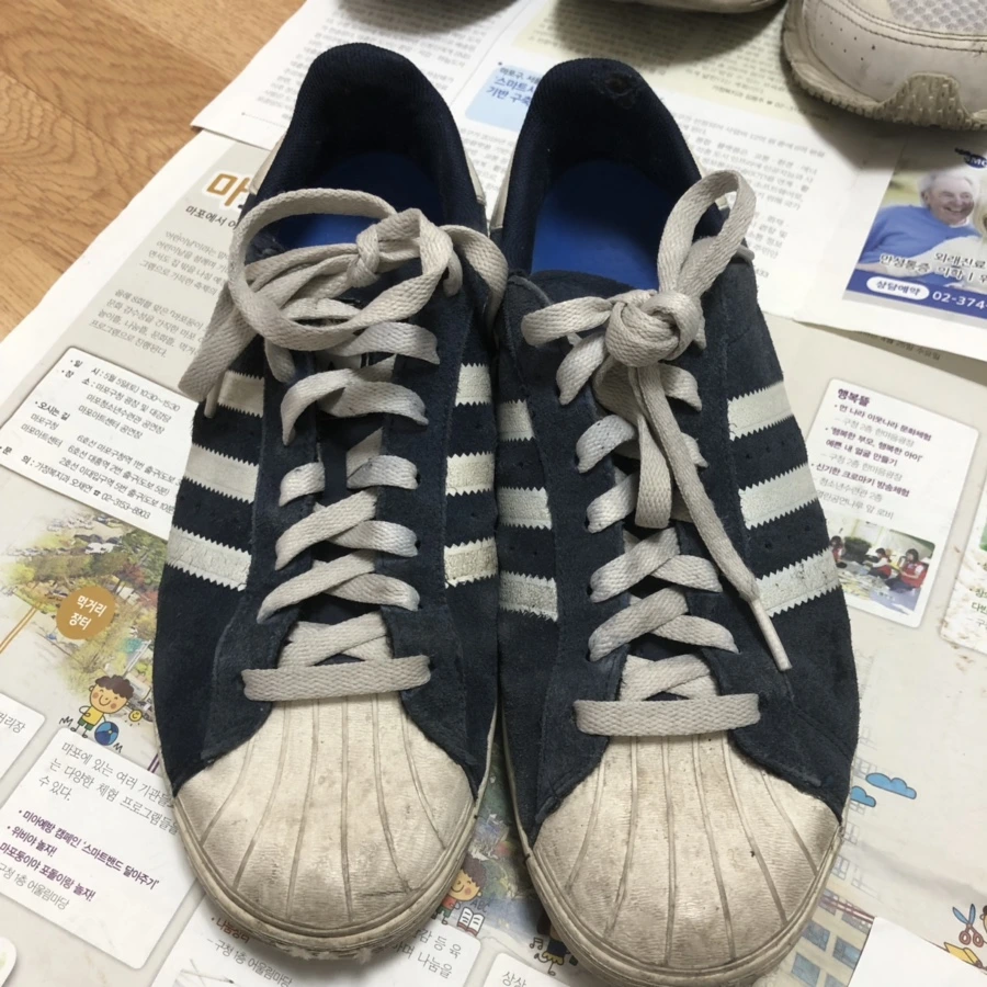 *아디다스 슈퍼스타(구매시기: 2015년 겨울)는 대학교 입학 전 엄마의 선물. 1년간 열심히 신었더니 먼지가 많이 묻었는데, 스웨이드 재질이라 이염세탁이 어려움. 이후로는 궂은 날씨(비/눈)나 등산 등 신발 오염이 높을 때 주로 신고 다님. 매우 낡음
