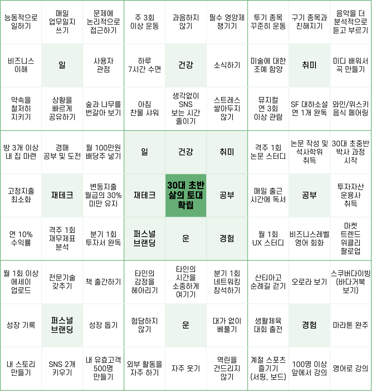 정리를 위해 만다라트 차트를 이용했다. 아래는 내 5년 후 목표를 넣은 만다라트 차트다. 모호하면 이행하기 어려울 것 같아 최대한 구체적으로 작성했다. 어려운 것도 있지만, 매일 할 수 있는 것들도 많다. 조금씩 성장하며 5년 후엔 내 삶의 토대를 확립했으면 한다.