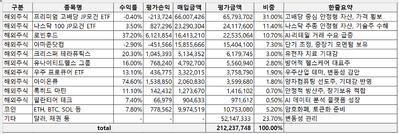 투자는 개인의 책임과 리스크를 수반합니다. 본 일지에서 언급된 자산, 전략, 예측 등 모든 내용은 미래의 성과를 보장하지 않습니다. 투자자분들은 자신의 상황과 목표에 맞추어 독립적인 판단을 하시기 바랍니다. 직접적인 투자 행동에 대한 책임은 독자에게 있음을 명확히 말씀드립니다.