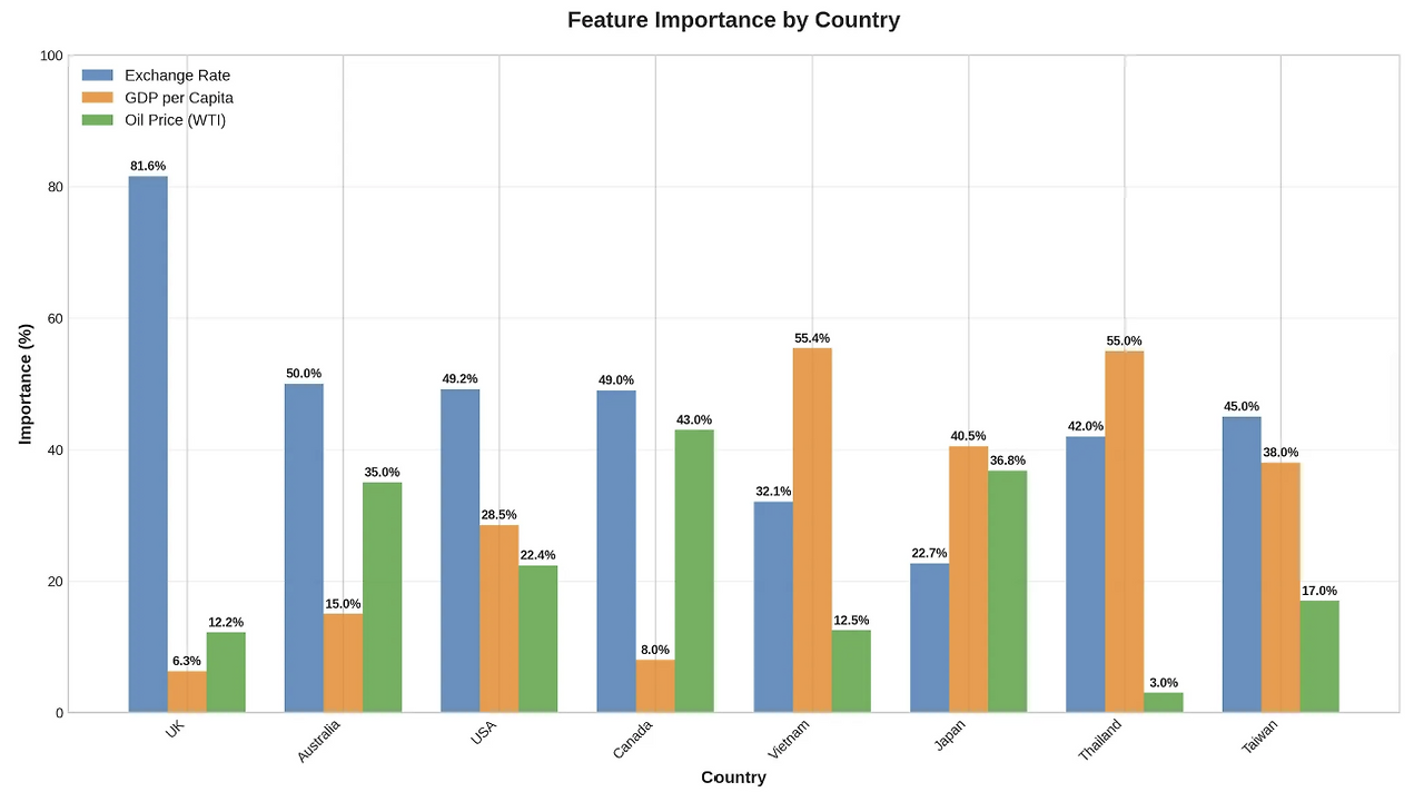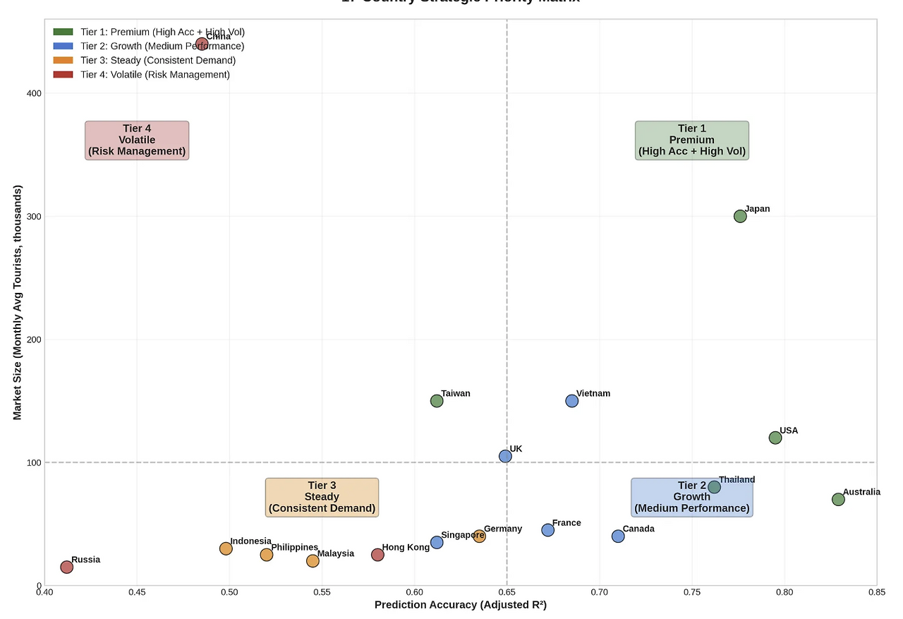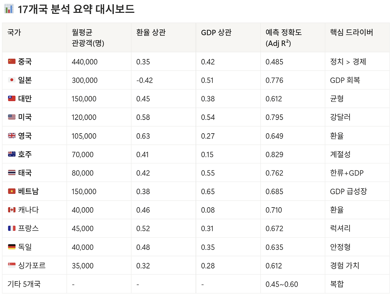 결론부터 말하자면, 거시경제 지표만으로도 관광객 움직임의 72%를 설명할 수 있었다. 하지만 더 중요한 것은 국가별 편차였다. 호주는 83%까지 예측 가능했지만, 중국은 49%에 그쳤다. 이 차이가 바로 전략의 실마리다.