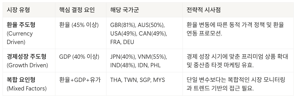 태국(THA): 환율(0.42)과 GDP(0.55) 모두에 민감하며, K-Wave의 영향으로 젊은 층의 수요가 탄력적이다.
