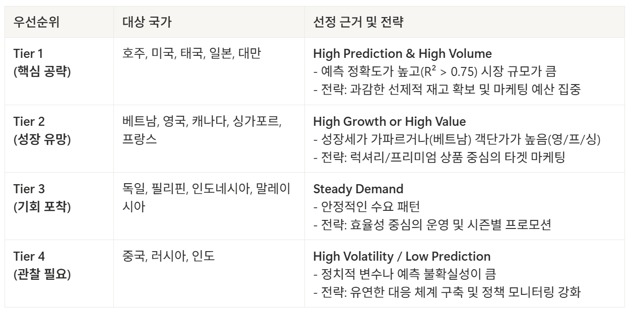 중국은 440만 규모로 방한객 1위다. 하지만 예측 정확도 49%로 하위권이다. 정치 변수로 언제든 수요가 증발할 수 있다. 반면 호주는 70만 명에 불과하지만 예측 정확도 83%다. 전략의 본질은 '많이 오는 시장'이 아니라 '예측 가능하고, 성장하며, 돈이 되는 시장'에 집중하는 것이다.