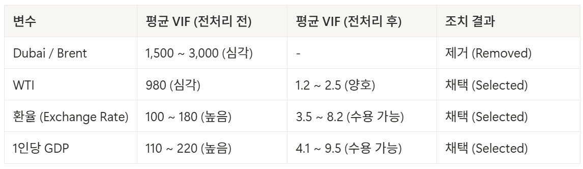 모든 국가 데이터에서 Dubai, Brent, WTI 세 가지 유종 간의 VIF(분산 팽창 지수)가 1,000을 초과하는 심각한 다중공선성이 발견되었다. 모델의 안정성을 위해 WTI 하나만 남기고 나머지는 제거했다.