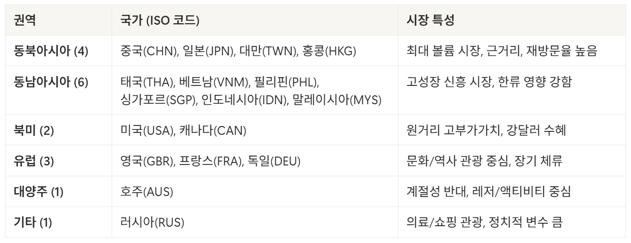 탐색적 데이터 분석(EDA) 결과, 17개국의 방한 수요 패턴은 권역 별로 뚜렷한 특징을 보인다. 주요 권역 별 분석 결과는 다음과 같다.