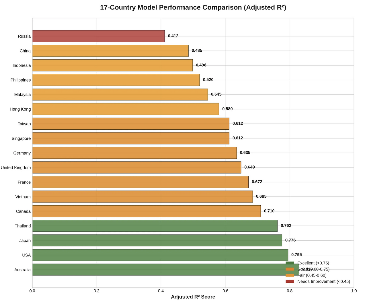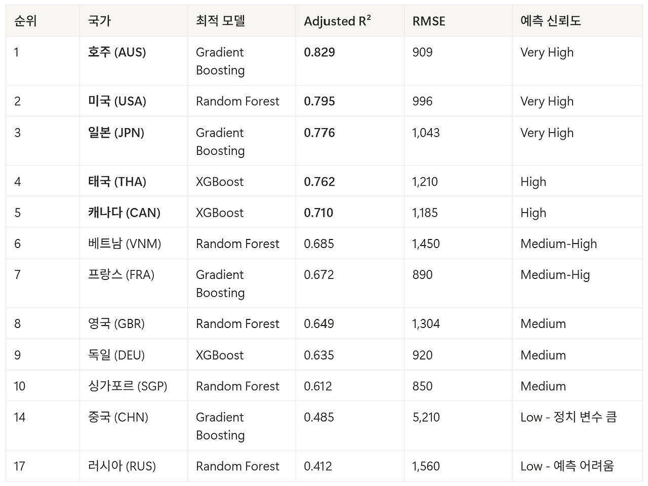 호주(0.829), 미국(0.795), 일본(0.776)이 예측 정확도가 최상위권이다.