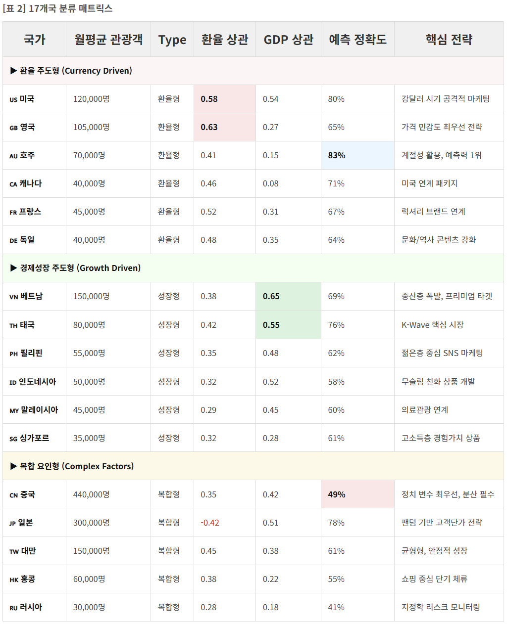미국인이 "달러가 세니까 한국 가자"라고 말할 때, 베트남인은 "이제 내 월급으로 한국 갈 수 있어"라고 말한다. 일본인은 "BTS 콘서트 보러 가야 해"라고 말하고, 중국인은 "정부가 허락하면 가겠지"라고 말한다. 17개국을 환율형(6개국), 성장형(6개국), 복합형(5개국)으로 분류한 이유가 여기에 있다. 각 그룹은 모두 다른 경제적·문화적 유인에 반응한다.