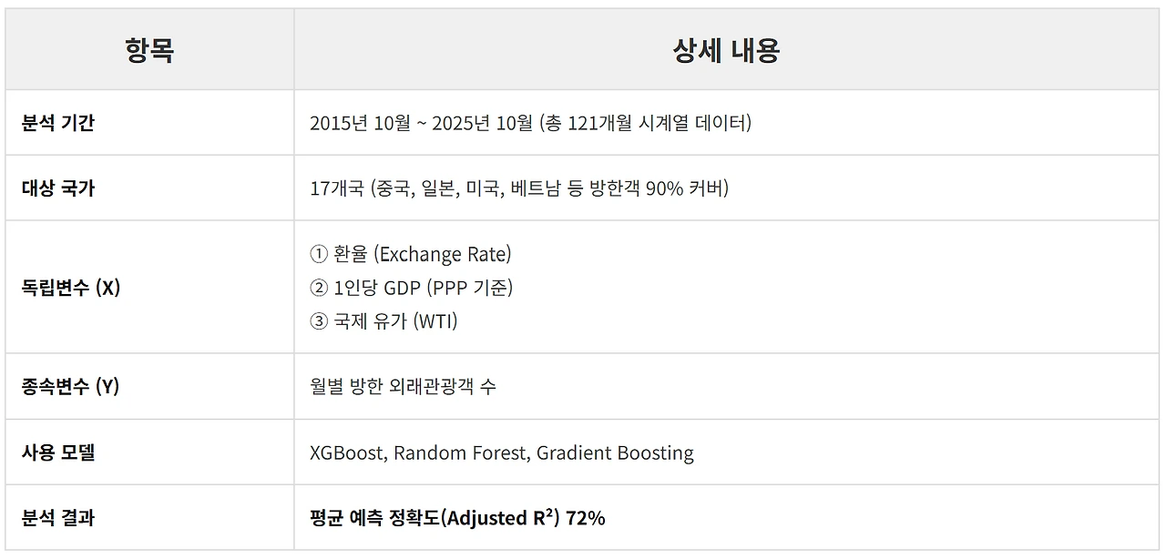 분석의 신뢰도를 높이기 위해 한국 인바운드 시장의 90%를 차지하는 17개 주요국 전체를 대상으로 했다. 단순 상관분석을 넘어, XGBoost와 Random Forest 같은 머신러닝 모델을 활용해 예측력을 검증했다.
