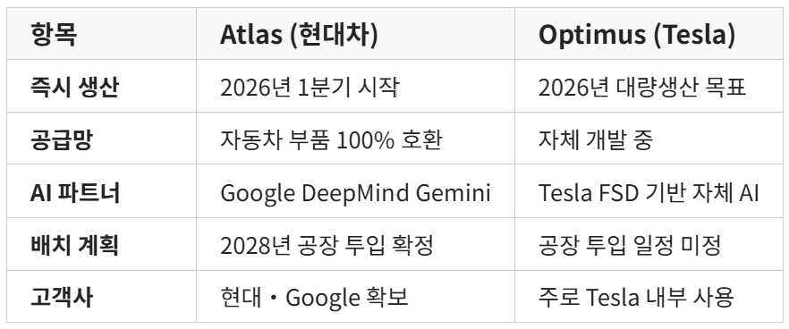 CES 2026에서 테슬라도 옵티머스를 공개했다. Interesting Engineering은 아틀라스는 적응형 작업에서 강점을, 옵티머스는 비용과 규모에서 우위를 보인다고 분석했다. 하지만 즉시 생산을 시작한 것은 아틀라스다.