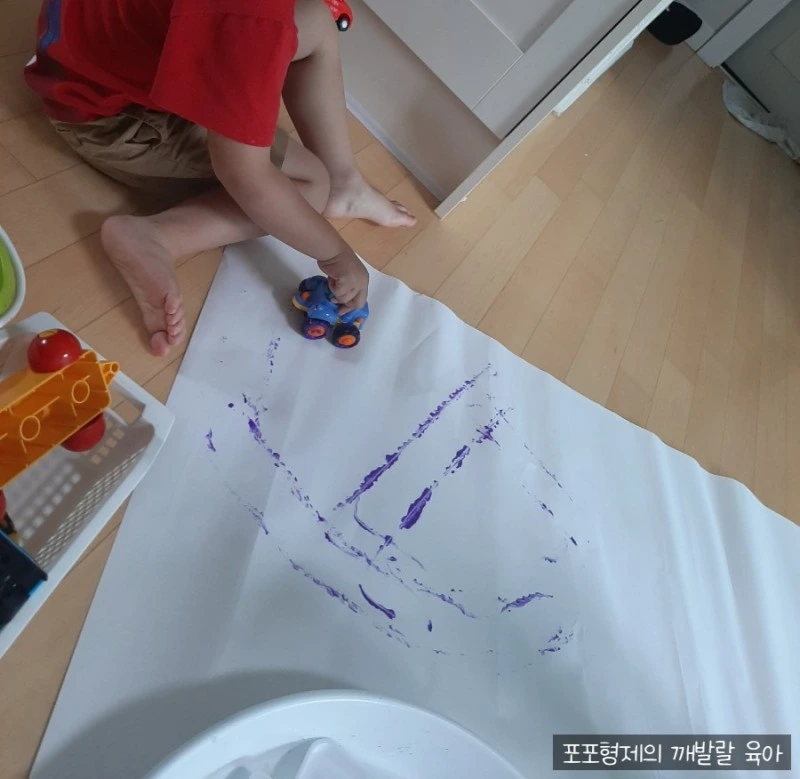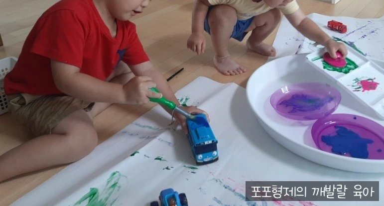 바퀴를 이용한 그림도 아이들이 좋아한다. 장난감 자동차 바퀴에 물감을 묻히고 자유롭게 굴려준다. 조금 하더니 장난감을 칠하는 활동으로 변했다. 항상 뜻하지 않게 놀이가 흘러간다. 그러더니 너무 재미있어하며 여러 대를 칠하고 말았다.
