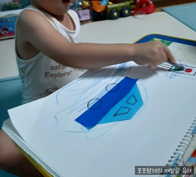 가장 간단하게 할 수 있는 활동이 종이 접기가 아닐까 싶다. 첫째는 소근육이 약해 잘하지 않았다. 그래서 일부러 기회를 만들어해 주곤 했다. 주로 내가 접어줄지라도 기회를 만들어 주고 싶었다. 종이접기를 하면 늘 스케치북에 붙여 그림을 그리게 했다. 경찰차로 하고 싶다며 경광등을 그려달라고 했었다.