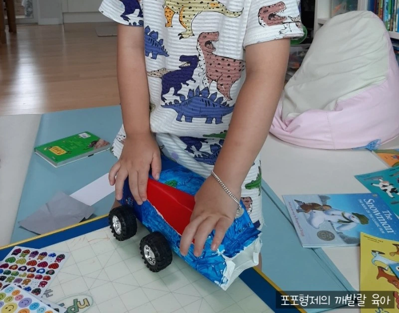 우유팩으로 자동차 만들기도 했다. 원하는 색의 물감으로 우유팩을 칠해준다. 물감이 마른 후 색종이와 스티커를 붙이며 꾸며주었다. 바퀴까지 붙여주니 그럴듯하다. 이렇게 물건을 바로 버리지 않고 재활용해서 만들기를 할 수 있다는 것도 알게 되었을 것이다.