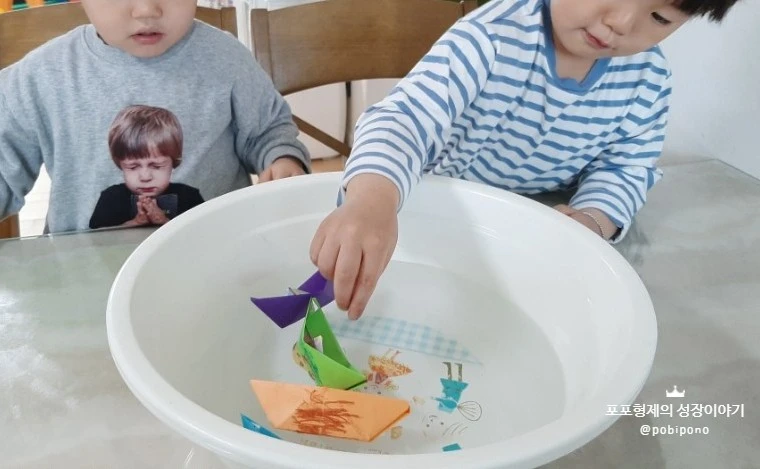 배를 이용해서 미술뿐 아니라 과학놀이도 할 수가 있다. 종이배를 접어서 물에 젖는 실험을 할 수 있다. 어떻게 하면 종이가 젖지 않을까 이야기해 보고 크레파스와 양초를 칠해서 넣어 보았다. 또 양초 녹인 물에 담갔다가도 넣었다. 엄마는 나름 준비했지만 아이들은 물에 띄우는 데만 집중했다. 그래도 물 출렁이게 하고 베끼리 합체시키면서 신나게 놀았다.