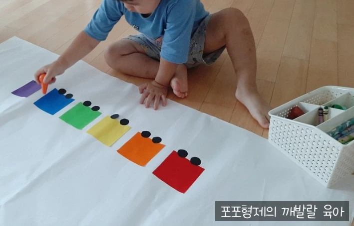 무지개색으로 색종이 골라서 기차 만들기도 해 보았다. 둘째가 3살 때 choo choo train을 외치며 한참 색칠했었다. 형을 따라 일찍 노출되니 말할 수 있는 영어단어가 많았다. 기차에 숫자나 색깔을 직접 써 보게 하면 자연스레 쓰기 활동과 연결될 수도 있다. 전지에 붙이면 아이들이 마음껏 그릴 수 있어 좋다.