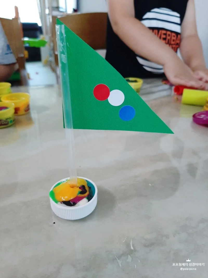 병뚜껑에 클레이 넣고 빨대 꽂아 세모난 종이 꾸며 붙여주면 간단하게 돛단배를 만들 수 있다. 배 만들기가 시작이었으나 클레이로 초밥 만들기가 이어졌다. 소스도 만들고, 디저트도 만들고 바다동물도 찍어주었다. 늘 엄마는 틀만 마련해 줄 뿐 이어가는 건 아이의 몫이다.