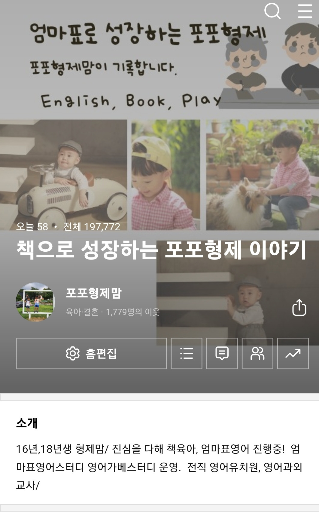 사실 블로그를 결혼 후 과외하면서 영어에 대한 기록을 위해 한동안 운영했다가 임신하면서부터 내려놓았었다. 다시 만들려고 초기화했었는데 그게 저품질이 온 것 같다며 새로 만들기를 권하셨다. 저품질이 오면 내가 아무리 글을 써도 노출이 되지 않는다 하셨다. 비록 열몇 개의 글이라도 나름 시간을 투자해서 썼기에 새로 만들기는 망설여지기도 했다. 하지만 어쩔 수 없기에 새로 만들었고 그렇게 지금 계정이 탄생하게 되었다.