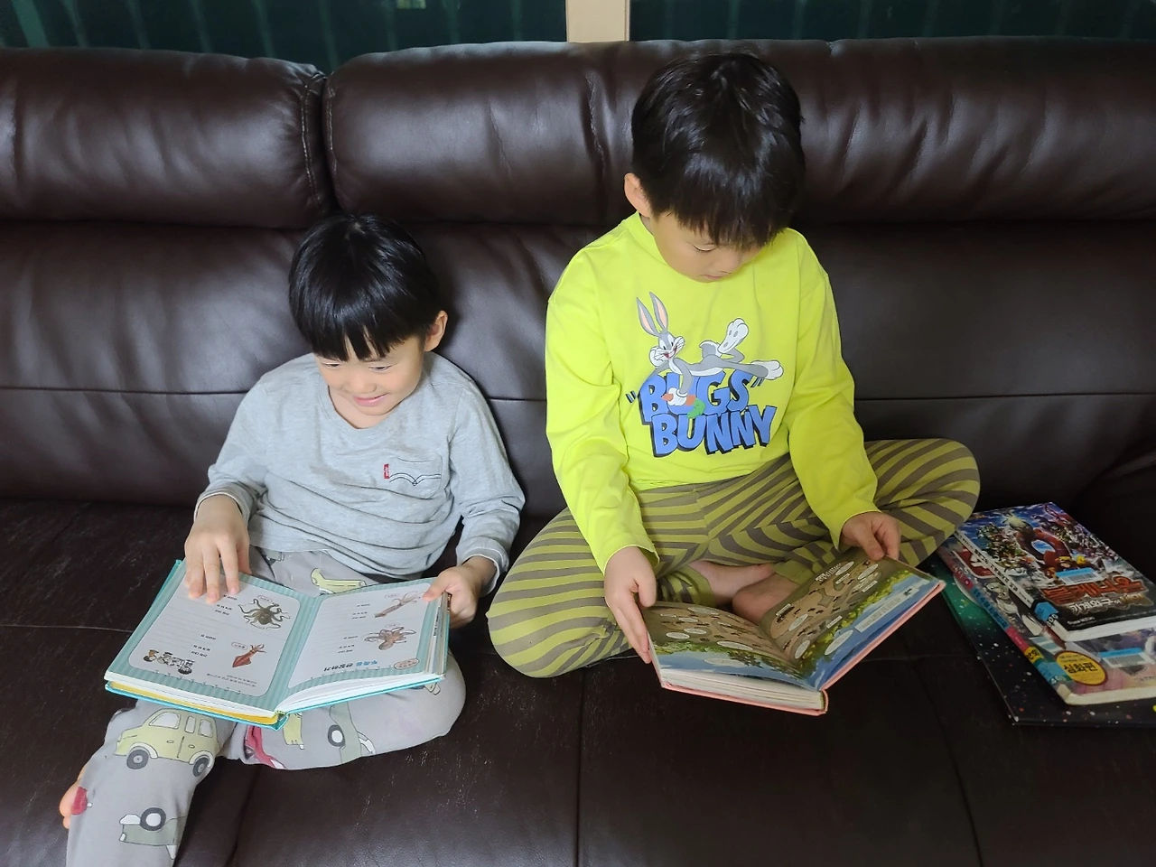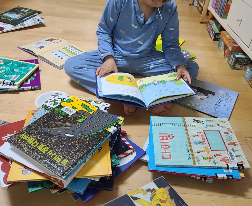 우리는 다둥이라 한 명이 10권을 빌릴 수 있고 가족을 합치면 한 도서관에서 40권을 빌릴 수 있다. 다른 도서관에서 빌린 것도 가능해 80권을 빌린 날도 있었다. 그렇게 여러 책을 빌려오니 말 그대로 아이들이 책의 바다에 빠져버렸다. 집에 있으면 그 책들을 보느라 정신이 없다. 그러면서 자연스레 집에 있는 책 이외에 아이들이 좋아하는 분야도 알게 되고 글밥의 수준도 높일 수 있게 되었다.