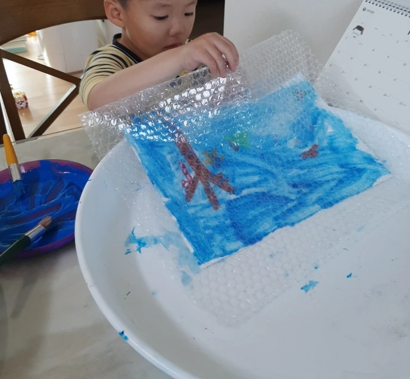 독후활동으로 뽁뽁이를 이용한 눈 풍경을 꾸며보았다. 아이가 직접 그려도 되고 어려워하면 엄마가 풍경을 그려준다. 그리고 배경을 물감으로 칠한다. 위에 뽁뽁이로 덮어서 눌러주면 눈 모양이 찍힌다.