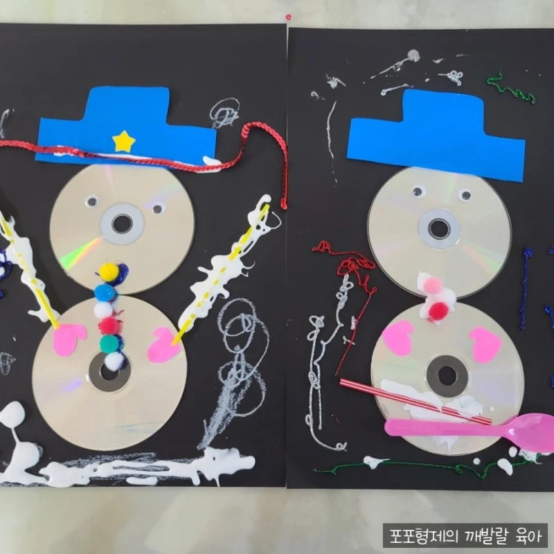 독후활동으로 시디를 이용한 눈사람을 만들었다. 시디를 위, 아래로 해서 검은 도화지에 붙여 주었다. 목공풀로 폼폼이랑 빨대를 먼저 붙였다. 반짝이풀도 짜고 크레파스로 그림까지 그려주니 멋진 작품이 탄생했다. 아직 자신의 표현에 자신이 없는 아이들은 이렇게 재료를 이용해 완성도를 높여주면 자신감이 생긴다.