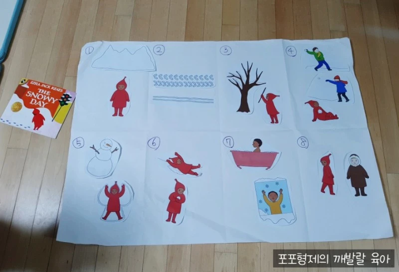 독후활동으로 키즈클럽에서 프린트 한 그림들을 이용했다. 전지에 책 내용을 기억해 순서대로 그림 붙이기를 해 보았다. 기억이 나지 않으면 책을 보며 기억을 더듬어 보았다. 아이들이 붙일 때 단어나 책의 문장을 옆에서 언급해지면 아이는 다양한 방식으로 반복을 경험하게 된다.