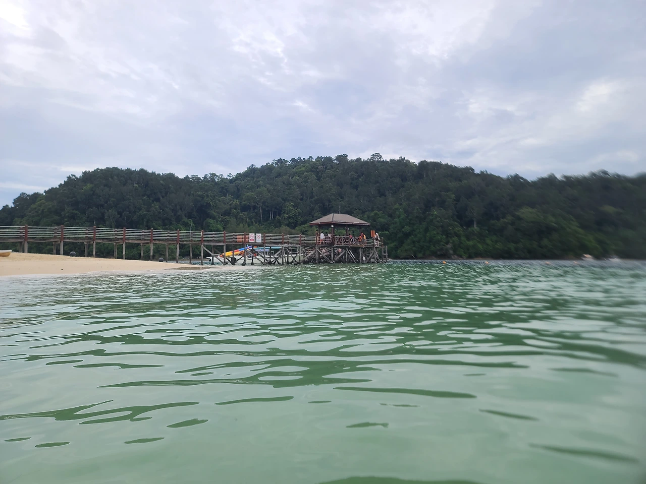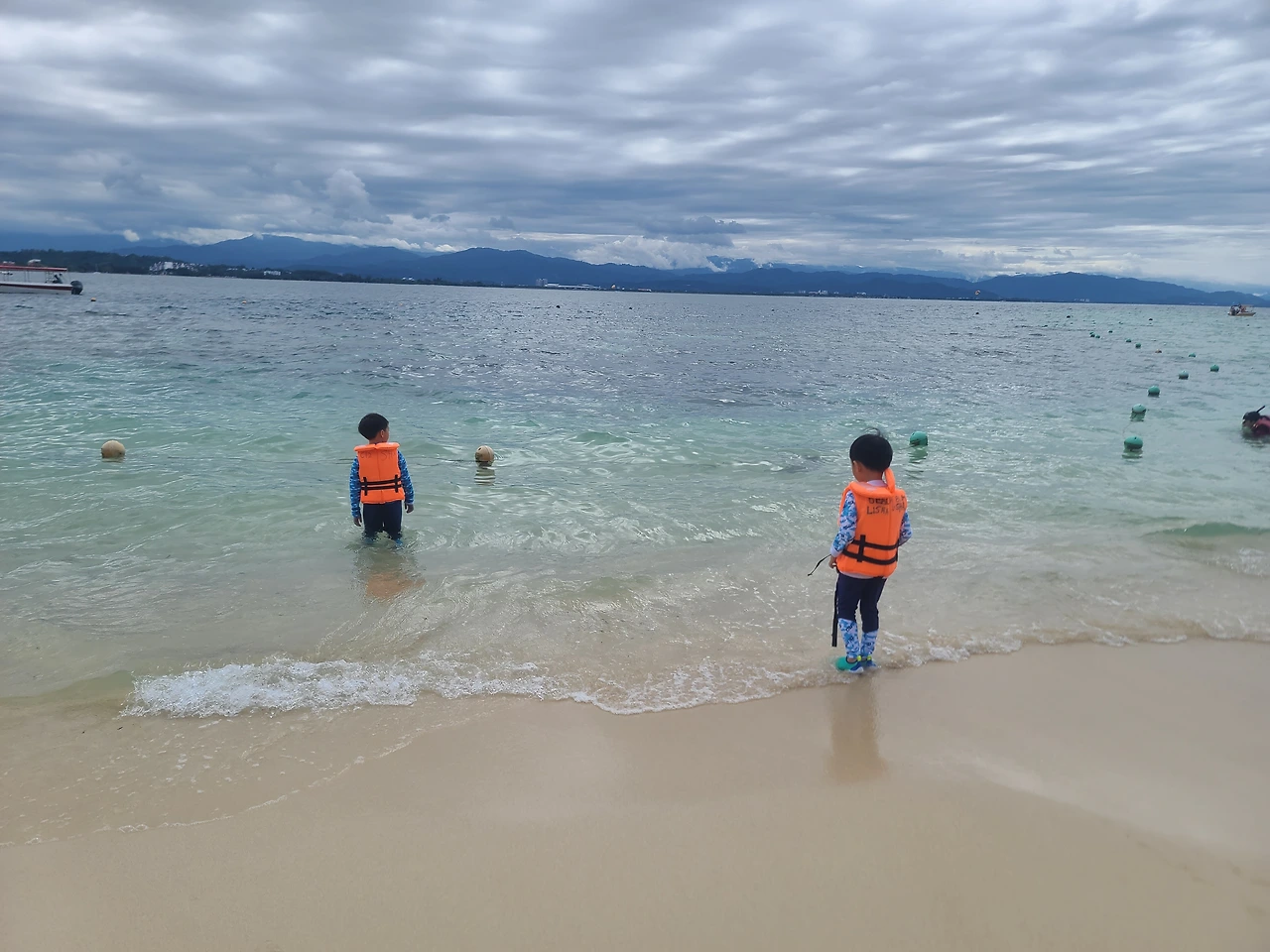 코타키나발루에서 20분 정도 보트를 타고 마무틱섬에 먼저 도착했다. 섬인지 뭔지 상관없이 그저 물만 봐도 신나는 첫째는 바다에 바로 뛰어든다. 상대적으로 조심성이 있는 둘째는 처음에는 해변에서 파도만 느끼며 놀다가 슬슬 들어간다. 우리나라와 다르게 고운 모래가 인상적이었고 아이들이 놀기에 참 좋았다. 수영을 하며 물고기가 옆에 지나다니는 것도 신기한 경험이었다. 스노클링을 챙겨갔지만 자꾸 물이 들어간다며 잘하지는 못했다. 1시간 정도 수영을 하고 남편이 섬 산책을 해 보자고 해서 걸어보았다.