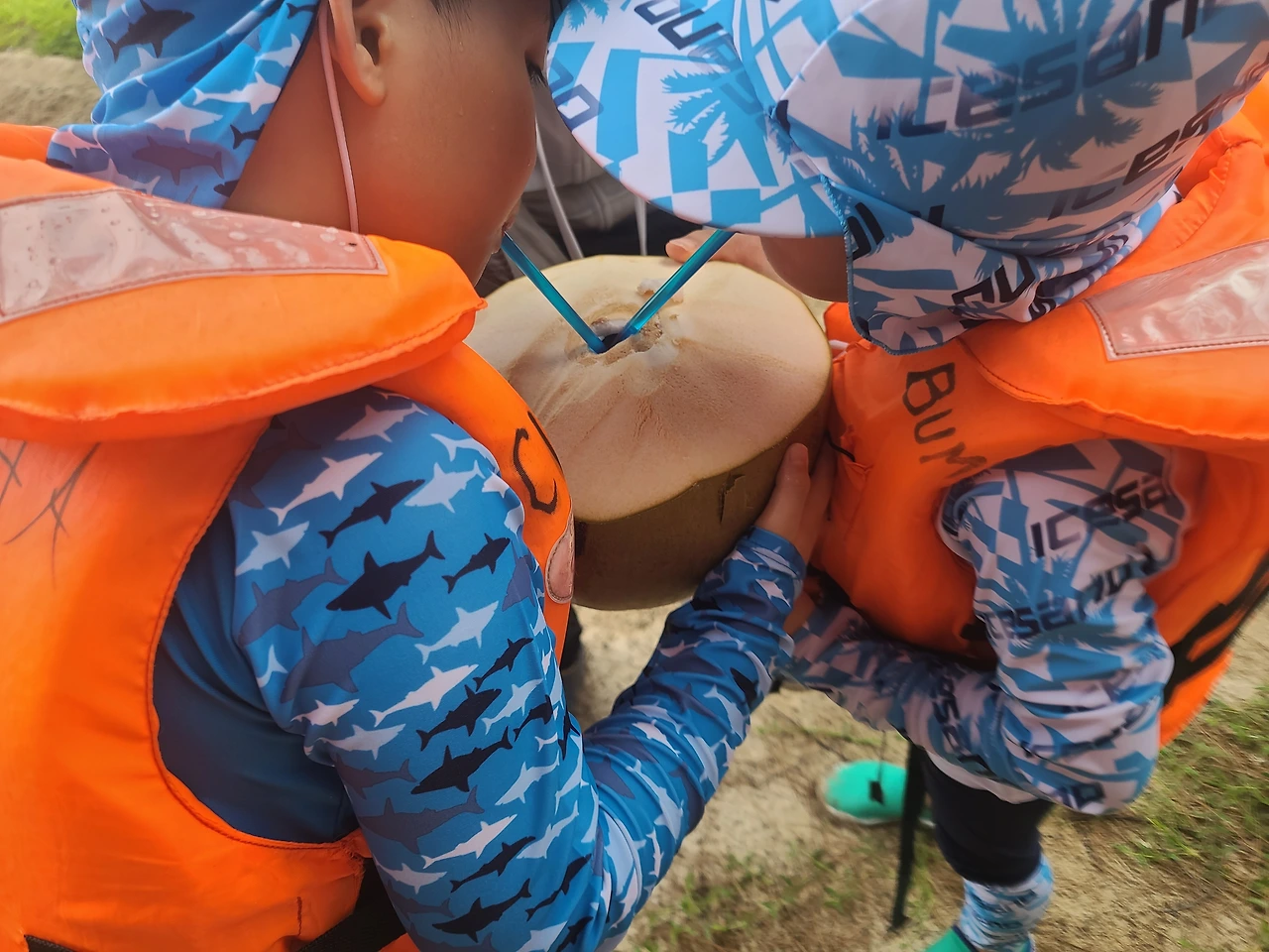 그렇게 마무틱섬에서 시간을 보내고 약속한 시간에 아까 내린 곳으로 가면 다른 보트를 타고 사피섬을 이동했다. 예약할 때 섬에 머무르는 시간을 정할 수 있는데 남편이 마무틱 섬은 좀 길게, 사피섬은 짧게 잡아서 사피섬에서는 그리 오래 놀지는 않았다. 사피섬으로 오니 배가 고파 오자마자 식당을 찾았다. 어제는 아이들이 현지음식을 잘 먹지 않아 볶음면, 계란 하나씩과 라면 하나만 시켰다. 그런데 웬걸~ 첫째가 볶음면을 혼자 다 먹는 것이다. 우리도 배고프던 찰나에 남편에게 얼른 우리 메뉴 또 시켜달라 했다. 둘째도 평소 먹지도 않던 매운 라면을 뚝딱 먹는 것이 아닌가. 역시 반찬투정이 웬 말이냐~ 시장이 반찬이다. 사피섬에서는 곳곳에 열매가 떨어져 있길래 우연히 주워서 아이들에게 주며 물고기 먹이하라고 했다. 그런데 이게 정말 먹혀서 물고기들이 오는 것이 아닌가. 그때부터 아이들은 의욕이 넘쳤다. 열매 더 가져오라는 둥, 이 생각을 해낸 엄마는 천재라는 둥 난리가 났다. 졸지에 난 천재가 되었다.