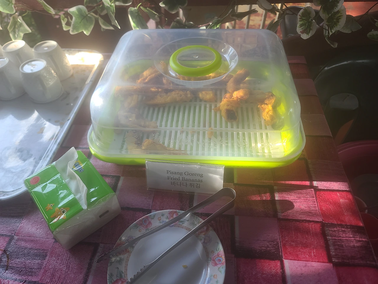짐을 다 싸서 리조트에 맡기고 투어차량을 기다렸다. 우리를 빼고는 모두 중국인이었다. 차량으로 한 시간 정도 걸리는 거리를 가기에 아이를 멀미를 걱정했는데 자면서 가 다행이었다. 도착하니 간식으로 바나나튀김과 주스가 준비되어 있었다. 둘째는 바나나튀김이 맛있다며 계속 얘기했다~ 역시 튀긴 건 다 맛있나 보다 ㅎㅎ