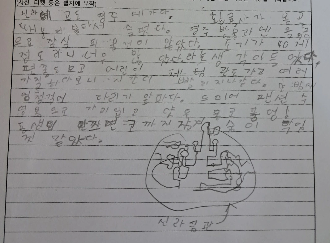 1일 차 시작 장소로 <국립경주박물관>을 택했다. 박물관을 데리고 가는 걸 좋아하는 내가 당연히 가야 하는 곳이었다. 도착하는 순간 규모에 깜짝 놀랐다. 서울에 있는 박물관 외에 지방에 있는 박물관도 몇 번 가본 터인데 유물과 전시가 정말 달랐다. 아이들도 집중해서 보는 것이 느껴졌다. 어린이체험실도 미리 예약해서 즐기고 <황룡사지 역사문화관>으로 이동했다. 아무런 정보도 없이 갔는데 영상을 보고 이해가 깊이 되었다. 첫째는 몽골에 의해 불탄 것이 너무 슬프다고 몇 번이나 얘기하고 체험학습서에도 그 부분먼저 썼다. 그래서 다녀봐야 하는구나를 더 느끼게 되었다. 여기를 오지 않고 책에서만 보았다면 이렇게 아이에게 깊게 와닿았을까 하는 생각이 들었다.