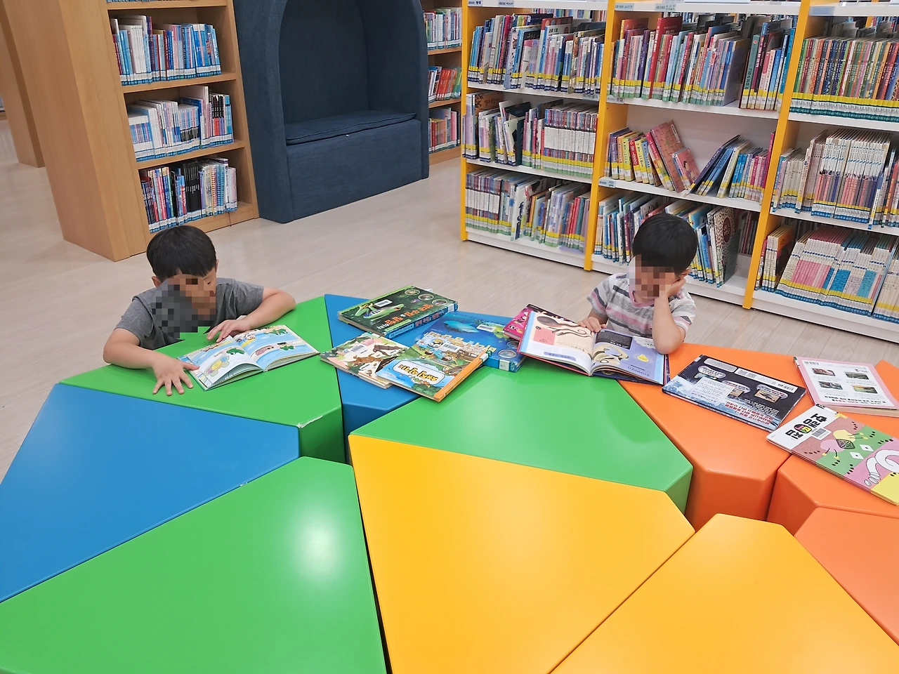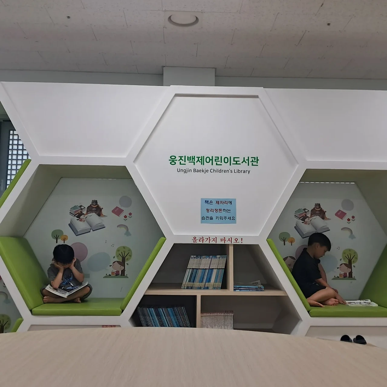 학습루틴은 꾸준히 지켰고 도서관도 자주 데려가려고 했다. 무주여행에서는 리조트에서 하고, 공주에 있다가 부여에 2일만 머무를 때도 아이들 문제집 8권을 들고 다녔다. 매일 조금씩 하기에 우리는 주말도 한다. 장소가 바뀌면 더 하기 싫어할 때도 있지만 이건 네가 꼭 해야 하는 거라는 인식을 가지게 해 주고 싶다. 이제는 어느 정도 성공한 것 같기는 하다. 예전에는 책을 나서서 보지 않았는데 어느 정도 습관이 잡히니 박물관이나 카페에 가서 책이 있는 곳이면 먼저 책을 꺼내서 본다. 익산 백제왕궁박물관에서는 부모님이 지루하실까 봐 빨리 나가려 했더니 책을 못 보고 갔다가 아쉬워하기도 했다. 공주에 머무르면서 공주, 세종에 있는 도서관을 거의 가 보았다. 각 도서관에 가서 아이가 먼저 책을 읽게 하고 조금 힘들 때쯤 좋아할 만한 그림책을 골라와 보고 싶은 것을 읽어주는 패턴을 이용했다. 어느 순간 놀이터보다 도서관에서 더 오랜 시간을 보내는 아이들이 되었다.