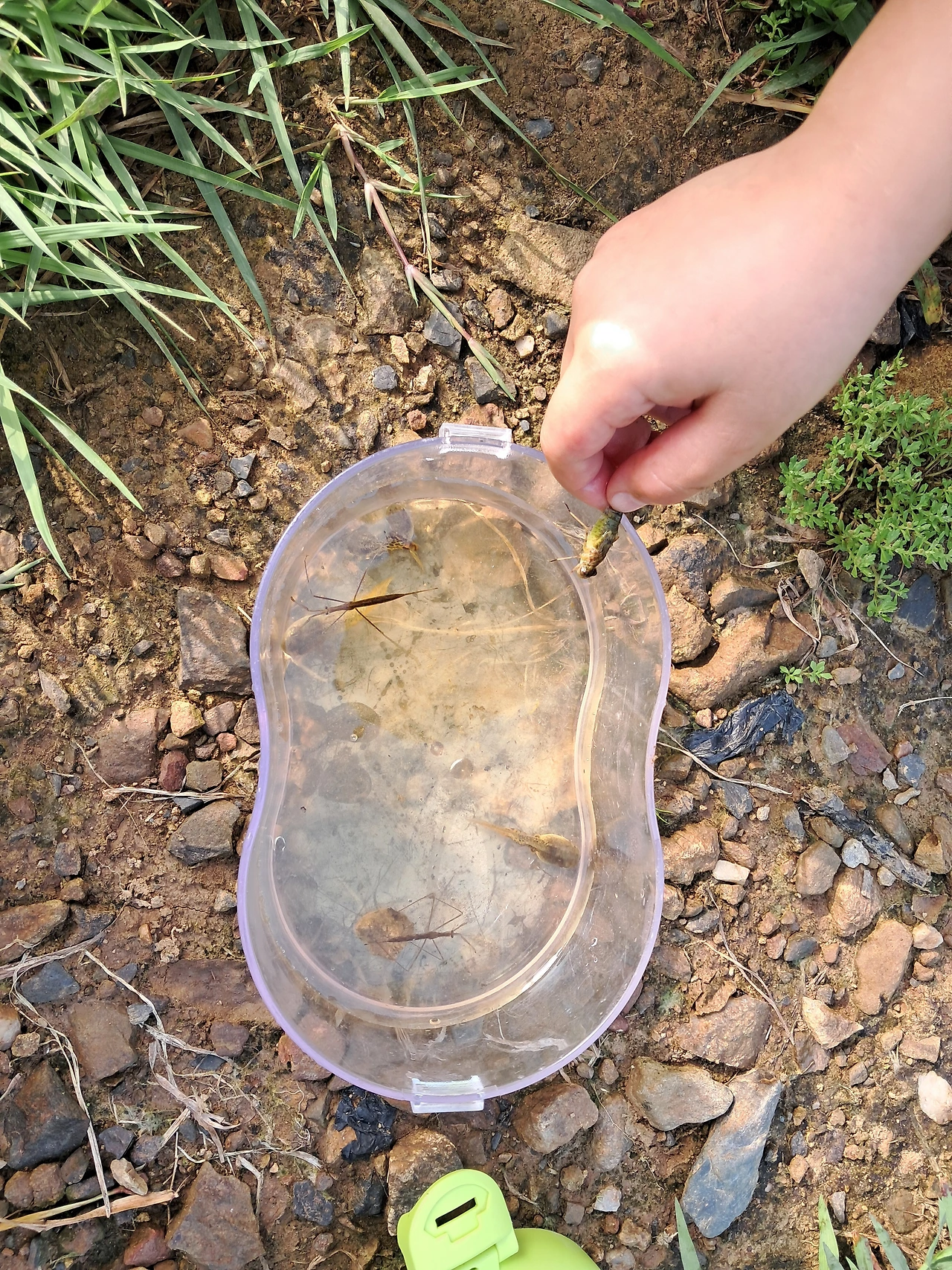 자연체험도 많이 한 여름이었다. 첫째가 올해 유독 곤충잡기에 빠졌었다. 우리는 뜨거워서 잠시도 밖에 있기 힘든데 곤충만 보면 무서운 집중을 보이는 아이였다. 어딜 가나 방아깨비, 메뚜기는 순식간에 잡아버린다. 집 근처에서 개미만 잡더니 다른 곤충을 너무 잡고 싶어 빨리 할머니댁에 가고 싶어 하던 아이였다. 부여에서 장수풍뎅이와 사슴벌레 잡기를 기대했는데 못 잡아 얼마나 실망했는지 모른다. 다행히 작은 연못에서 소금쟁이, 올챙이, 송장 헤엄치개 등을 잡고 기분이 풀렸다. 아빠와 예전에 우연히 공주산림휴양마을에서 잡은 사슴벌레를 기억하고 그걸 잡고 싶어 계속 이야기하던 아이였다. 그래서 남편과 마지막날 갔는데 풍뎅이 한 마리를 잡아왔다. 얼마나 좋아했는지 모른다. 시댁 근처에 있는 천에서는 송사리, 잠자리 등을 잡고 놀았다.