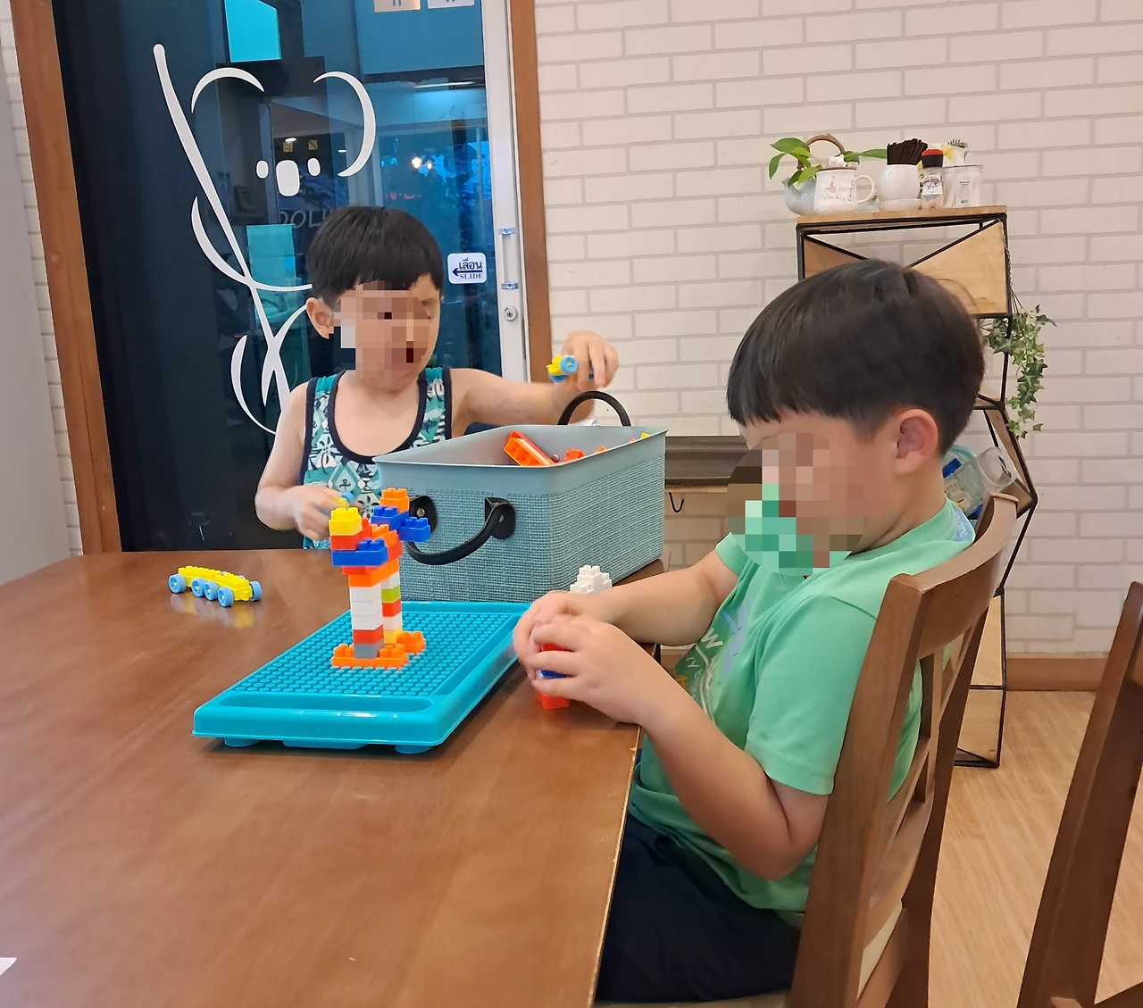 식당 옆에는 작은 블록 장난감이 있어, 아이들은 그곳에서 놀며 우리 식사를 기다려주었다.