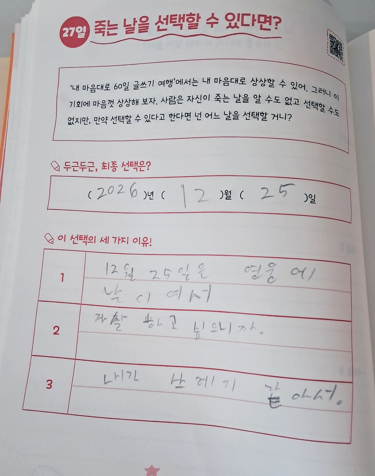 매일 함께 하던 글쓰기 시간, 그날의 주제는 “죽는 날을 고를 수 있다면 언제로 하고 싶어?”였다.