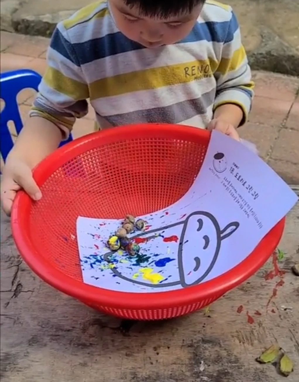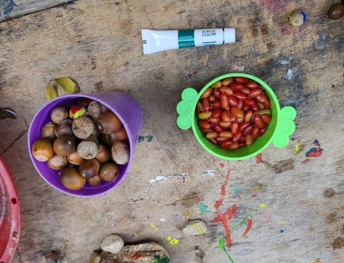 세 번째는 도토리를 이용한 놀이다. 주변에 도토리가 떨어져 있으면 내가 더 신나기도 한다. 가끔은 엄마가 더 열심히 모을 때도 있다. ㅎㅎ 도토리에 물감을 묻혀 굴리며 그림을 꾸밀 수 있다. 이때 첫째는 도토리에 직접 색칠하며 놀이를 하기도 했다. 엄마가 의도하지 않은 놀이로 확장될 때 그걸 보면 더 신나는 엄마이다. 그리고 가장 많이 하는 소꿉놀이가 있다. 그릇에 담아 엄마 먹으라고 주기도 하고 개미집을 꾸며주기도 했다.