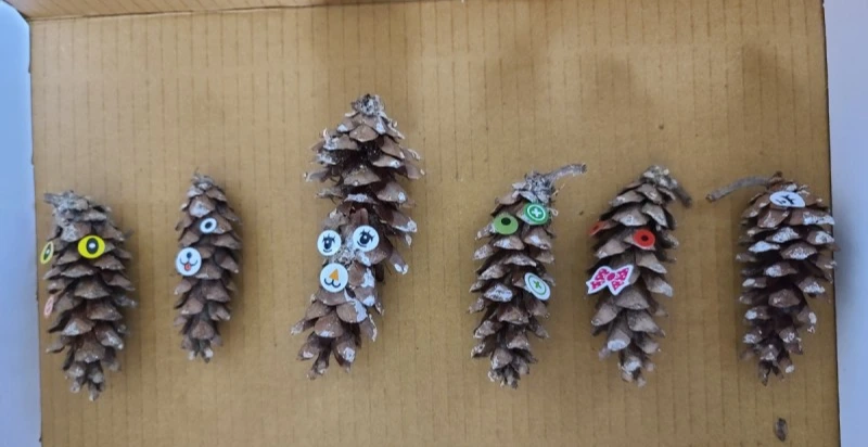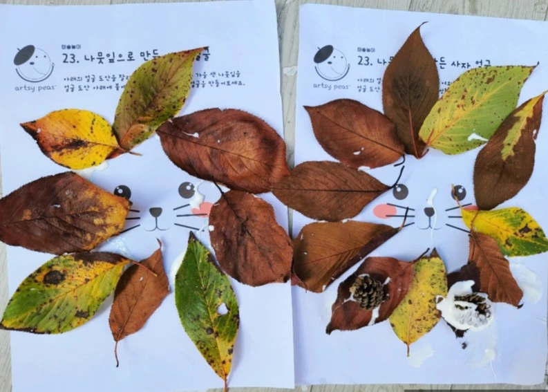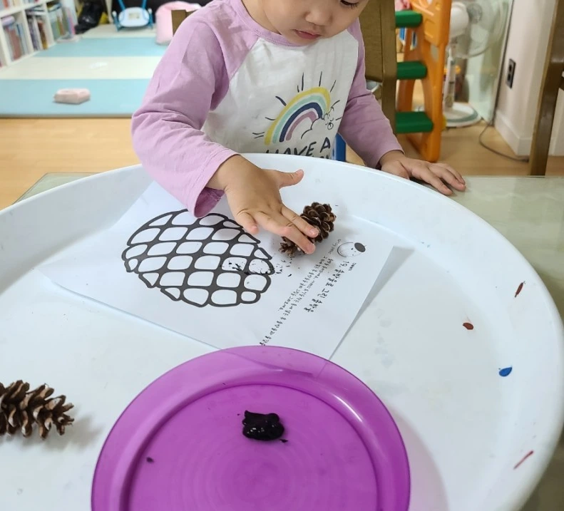 첫 번째는 솔방울로 한 놀이들이다. 솔방울에 물감을 묻혀 굴려서 그림을 꾸며보았다. 다음은 다이소에서 눈코입 스티커가 있어서 그걸 붙이고 솔방울 인형들을 만들어 보았다. 이건 첫째가 역할놀이도 하며 정말 즐겁게 참여하였다. 제주도 여행 갔을 때는 솔방울을 모아 와서 어느 것이 큰지, 작은지 비교도 하고 저절로 수학놀이도 되었던 기억도 있다. 이렇게 굳이 비싼 교구가 아니더라도 자연물로 수학, 과학, 미술 등 여러 영역으로 놀이가 확장된다.