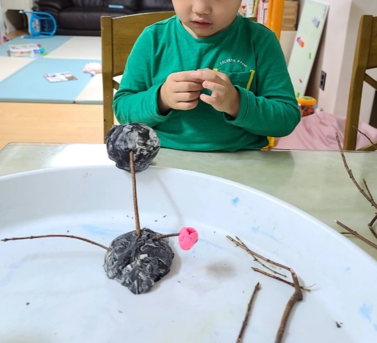 두 번째는 나뭇가지로 한 놀이들이다. 나뭇가지를 잘라서 글씨를 표현하며 글자와 친해질 수 있다. 한글, 영어, 숫자 등 엄마가 먼저 선 보이면 자연스레 아이도 동참하게 된다. 이렇게 글자교육까지 가능한 자연물들이다. 또, 클레이를 추가해 주어 나뭇가지를 꽂게 하여 다양한 작품을 만들 수도 있다. 어제 첫째가해 준 말에 의하면 유치원 숲체험에서 나뭇가지 누가 높이 쌓나 게임도 했었다고 한다.