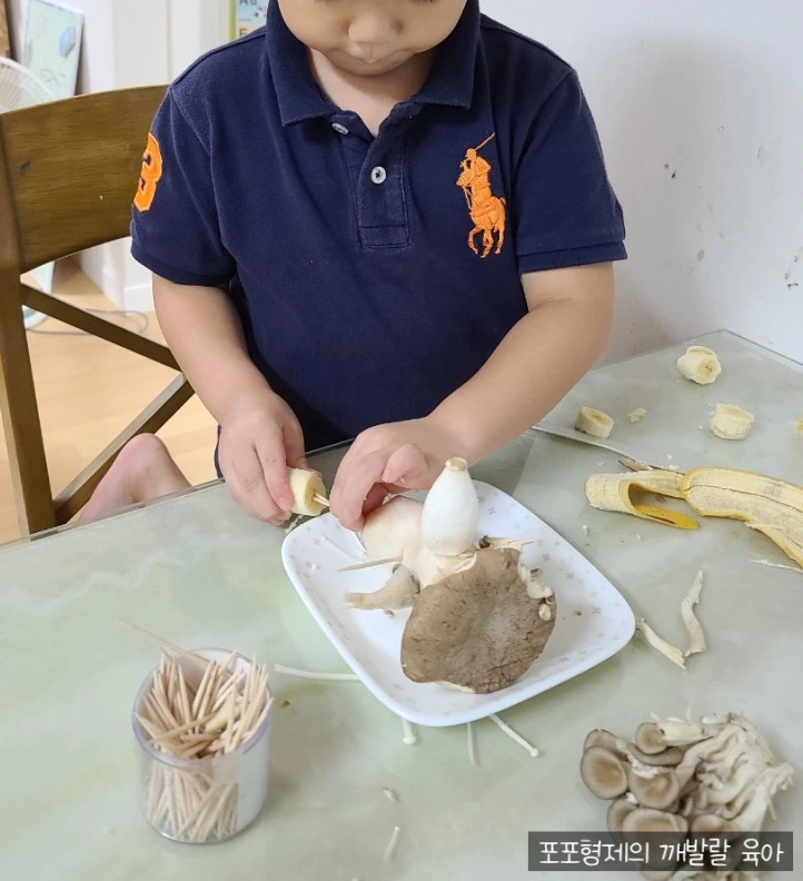 다음에는 이쑤시개를 주며 꽂아서 여러 모양을 만들어 보게 했다. 첫째는 몇 개를 꽂더니 사람을 만들었다. 둘째는 형아 따라 하기 바쁘다. 그래서 놀이 사진을 보면 늘 둘째의 눈은 형아에게 가 있는 걸 볼 수 있다.