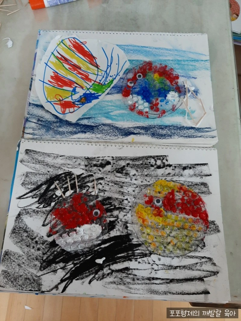 두 번째로는 복어 만들기도 해 보았다. 뽁뽁이를 동그라미 모양으로 잘라 물감으로 색칠한 후 말려준다. 바다배경은 파스텔로 칠해서 꾸며준다. 복어가 마르면 스케치북에 붙이고 눈알과 이쑤시개로 표현해 준다. 첫째는 이쑤시개로 가시를 안 하고 꼬리를 표현하겠다고 했다. 그럴 때는 언제나 아들을 지지해 주는 엄마다.