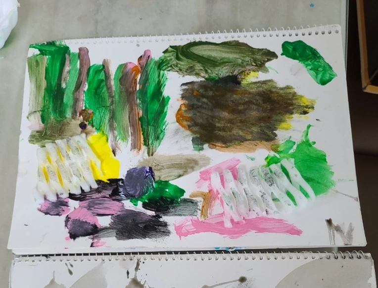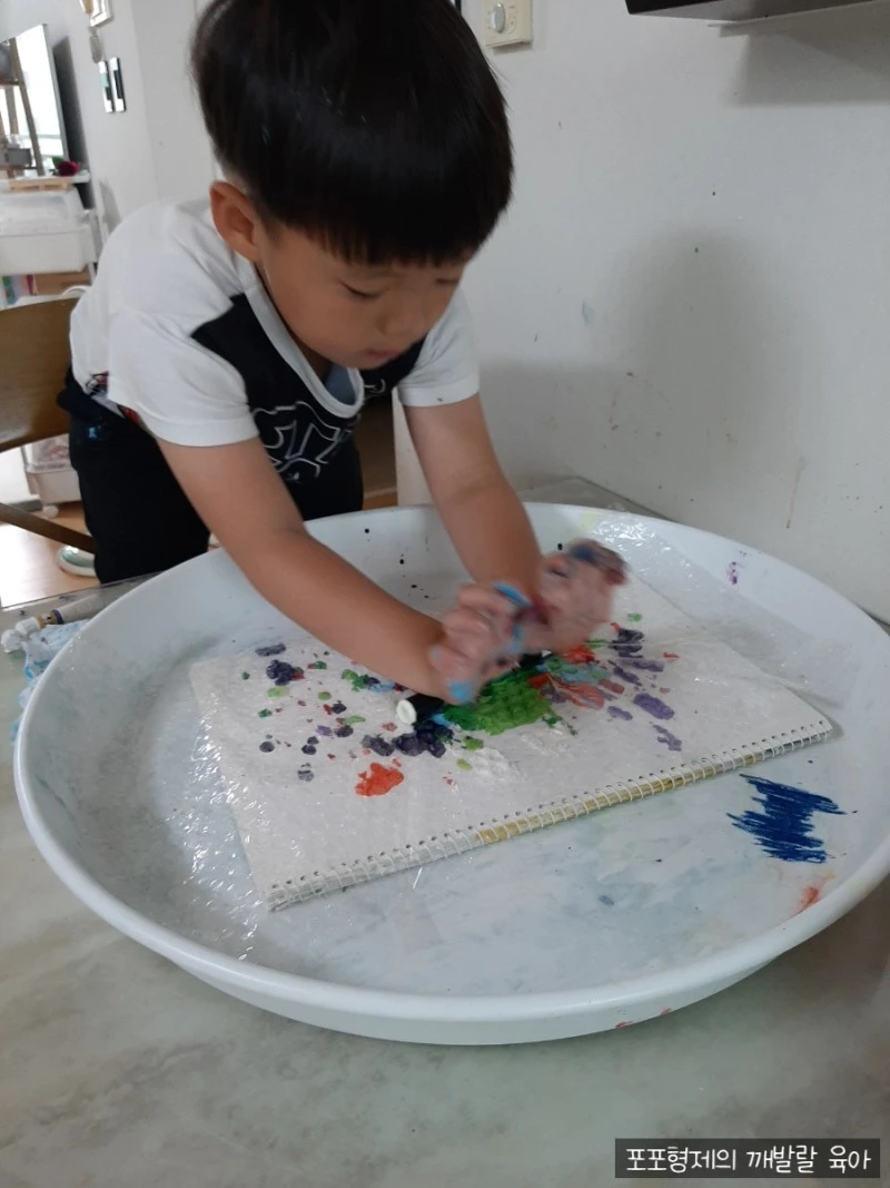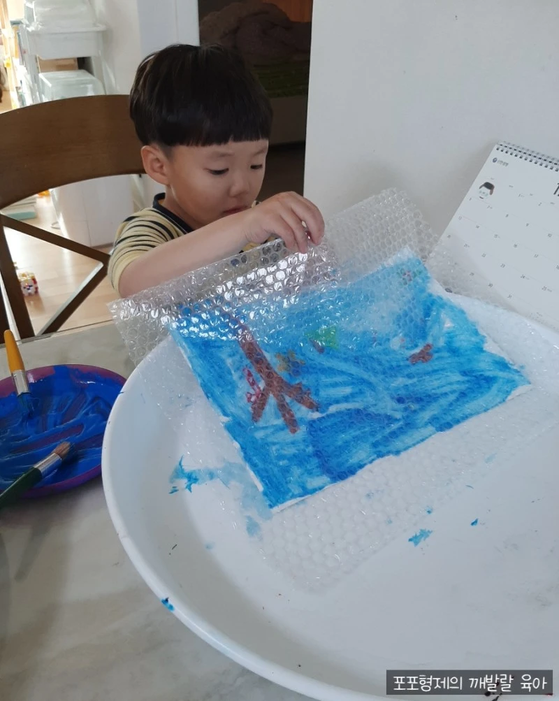 스케치북에 물감을 짠다. 그리고 뽁뽁이를 그 위에 놓고 매직이나 펜으로 밀면 예쁜 그림이 탄생한다. 뽁뽁이 밀 때 나는 소리도 재미있었고 물감이 퍼지며 새로운 색들이 탄생하는 것도 새로운 경험이었다.