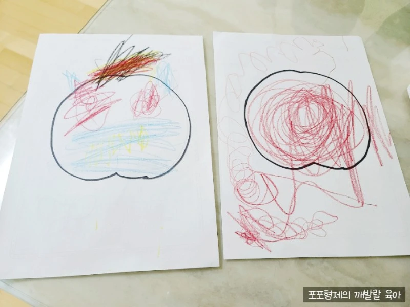 위의 두 활동이 조금 복잡하고 부담스럽다면 간단한 활동들도 있다. 책에 구멍이 있기 때문에 그 페이지를 흰 종이에 대고 따라 그려도 된다. 그래서 얼굴 모양만 그려준 뒤 나만의 몬스터 그리기를 해 보았다. 둘째는 무섭게 한다고 빨간색으로 칠하더니 옆에 1자를 쓰고 텐이라고 말해서 웃었었다. 한창 넘버블럭스를 좋아해 모든 게 숫자와 연결되던 시절이었다. 이때 내가 표현한 것을 말로 표현해 달라고 하면 좋다. 영어로 말해달라니 아직까지 색만 표현해 주었었다.