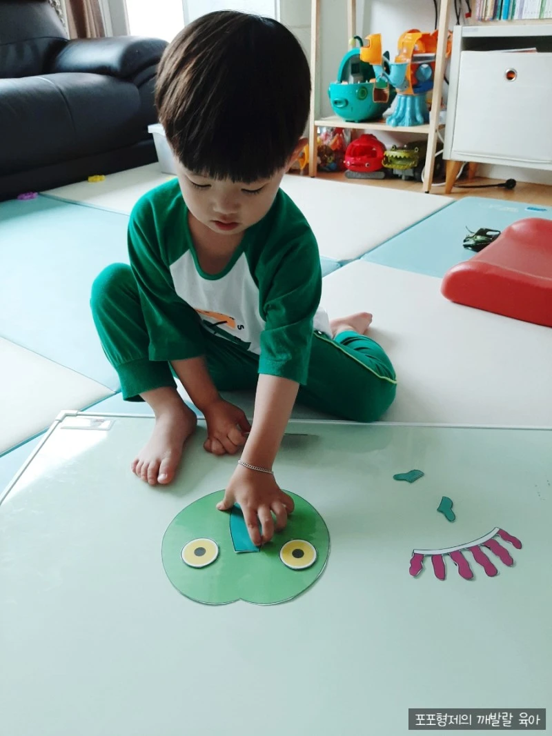 키즈클럽에서 도안을 프린트하고 코팅을 했다. 그리고 뒤에 자석테이프를 붙여서 아이와 보드에 붙이며 얼굴 만들기를 했다. 이때 엄마가 옆에서 책의 내용을 읽어주거나 말해주면 아이는 자연스레 표현을 반복하고 익힐 수 있게 된다. 대부분 누리과정 주제는 비슷하기 때문에 5세 때는 간단히 활동했다면 6세 때는 조금 난이도를 높여서 놀이를 했었다. 같은 재료로 "What is missing?"게임을 했다. 눈 감은 후 얼굴 부분을 하나 숨긴 후 물어보는 것이다. 그럼 아이가 "Eyes are missing."이라고 대답한다. 그런데 이때 첫째가 "Eyes are gone."이라고 대답해 감동을 했었다. 알고 보니 유치원 영어시간에 읽었던 스토리북을 응용한 것이었다. 이렇게 아이는 어른과 달리 자기가 들은 표현을 쉽게 응용한다.