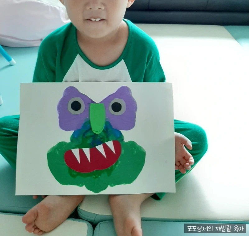 몬스터 얼굴을 데칼코마니 기법을 활용하는 것도 재미있다. 도화지를 반으로 접은 다음 물감을 짜고 접으면 똑같은 그림이 나타난다. 물감이 마른 후에 눈, 코, 입을 자유롭게 붙여주면 된다. 이 때도 그냥 붙이기보다는 책에서 본 표현을 옆에서 반복해 주는 것이다. 그럼 아이들은 들으면서 단어 하나라도 따라 하는 모습을 볼 수 있다.