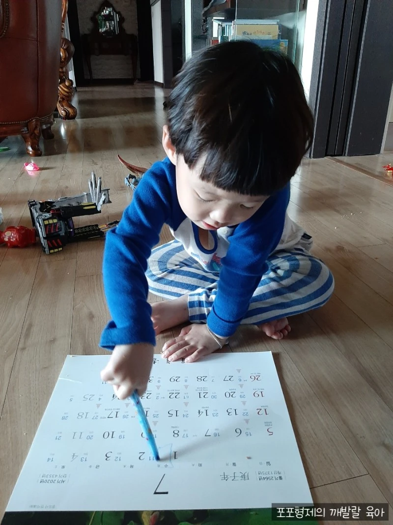 숫자 익히기에 좋은 건 역시 달력이 최고다. 달력 가지고 와서 엄마가 말하는 숫자 동그라미 해 보기도 하고