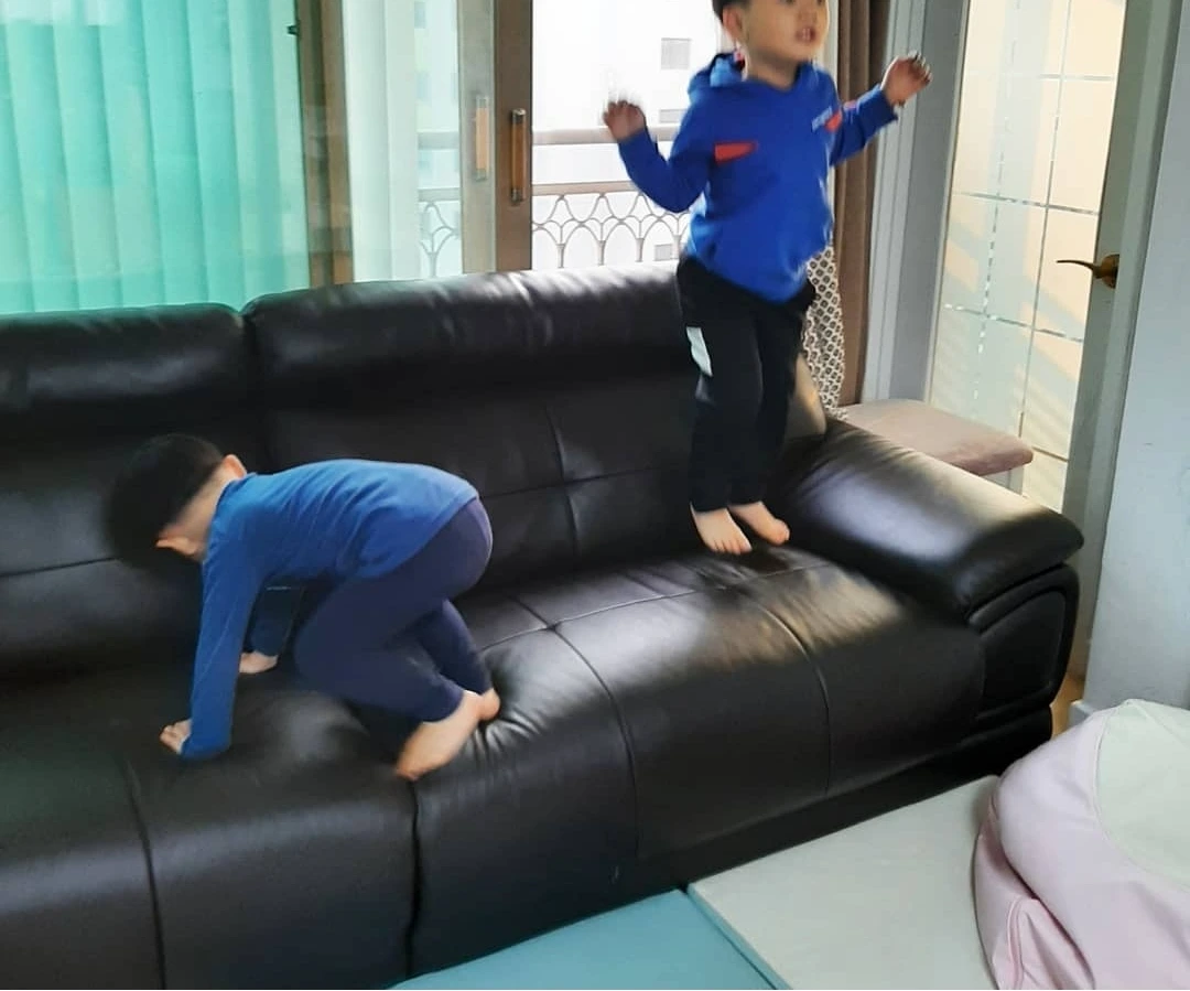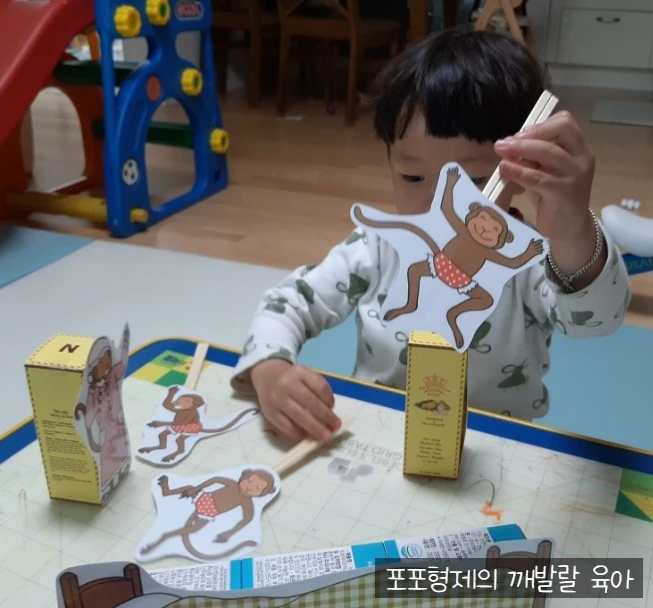 다른 하나는 역시 키즈클럽 도안을 활용했다. 상자와 나무젓가락을 이용했더니 자유롭게 놀이하며 노래하는 모습을 보였다. 원숭이가 침대에서 뛰어보게 하고 몇 마리 남았는지 숫자로 직접 찾아오게 했다. 책을 여러 번 읽었다고, 노래를 여러 번 들었다고 저절로 영어로 따라 하는 아이는 많지 않을 것이다. 그럴 때 엄마가 약간의 도움을 주면 아이는 영어로 말하는 것에 거부감이 없다. 즉, 엄마는 판을 깔아주는 것이다.