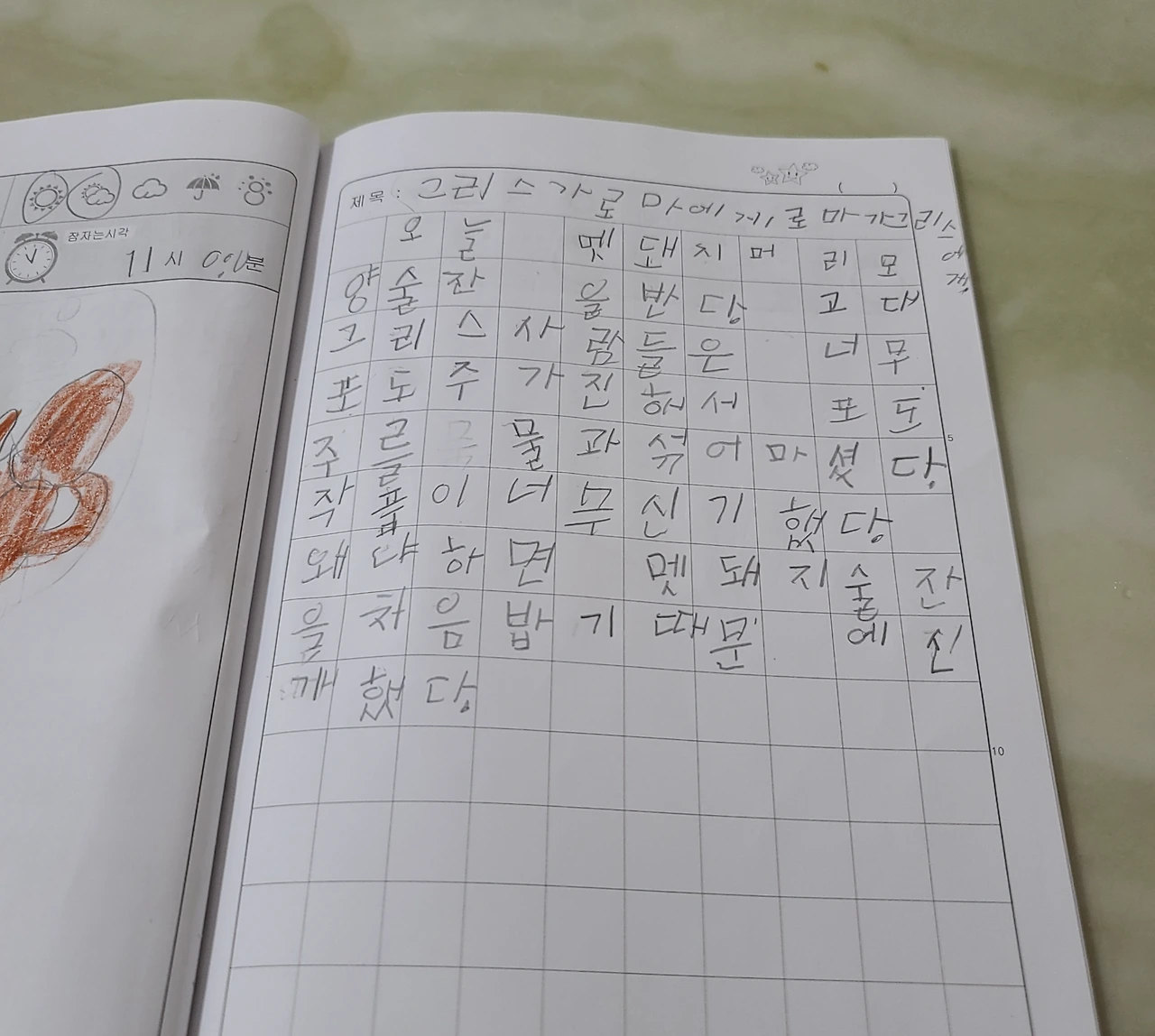 읽기가 느리니 쓰기도 당연히 다른 아이들에 비해 느렸다. 쓰기를 시도해 보려 해도 남자아이다 보니 쓰는 것을 싫어하고 힘들어했다. 그런데 이번 방학에 일기를 꾸준히 쓰는데 놀란 점이 있다. 내가 옆에서 이야기하며 도와주었다고 해도 자기 생각을 나름 잘 표현하고 풍부하게 쓰려고 했다. 불과 몇 달 전만 해도 단어만 따라 쓰던 아이가 몇 개월 사이에 이렇게 발전한 것이 놀라웠다. 맞춤법과 띄어쓰기는 아직 엉망일지라도 자기 생각을 써 내려가는 모습으로도 너무 만족스러웠다. 역시 때 되면 되는 것을 내가 너무 걱정했구나 싶었다.