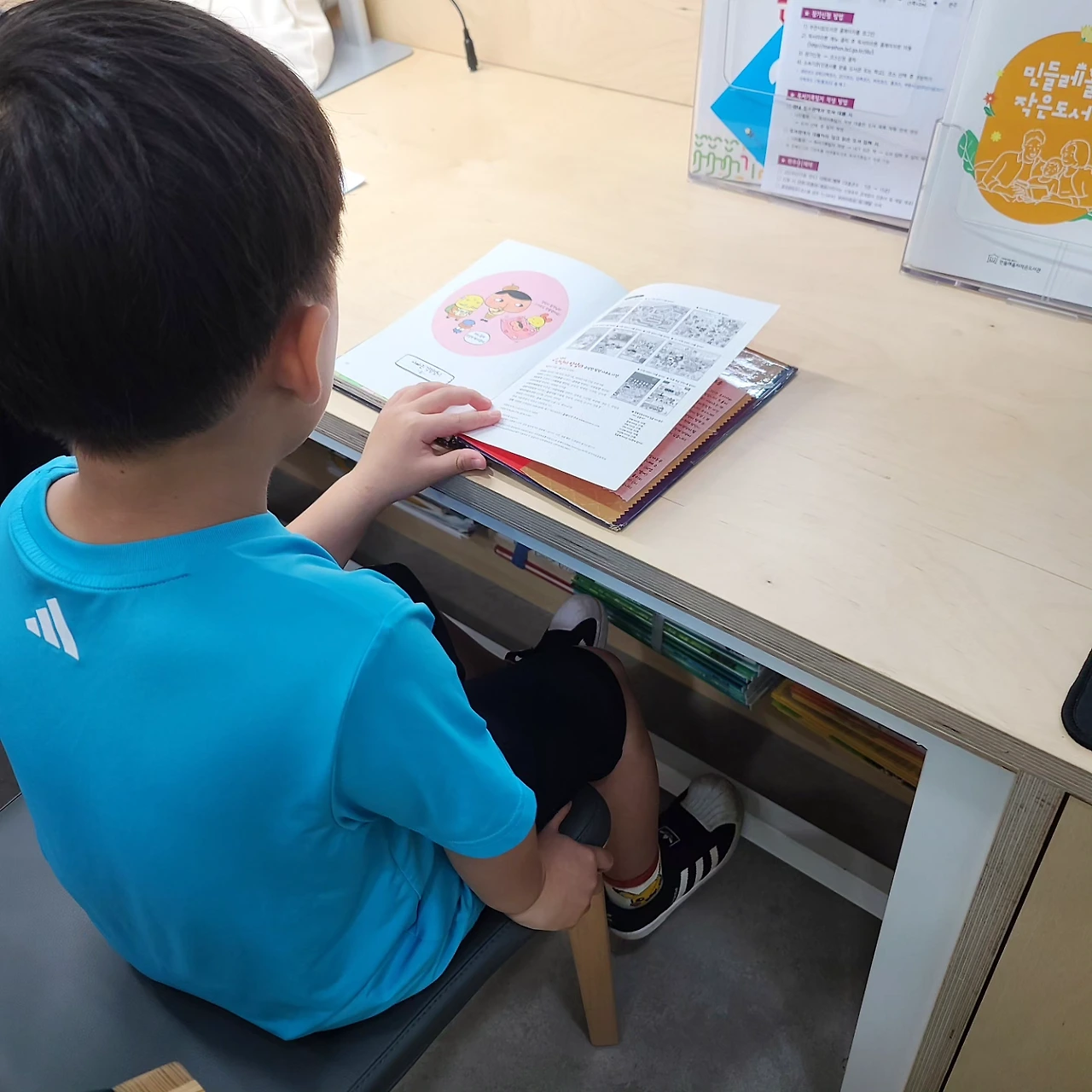 내가 첫째에게 가장 걱정했던 부분은 읽기 독립이었다. 한글을 늦게 떼서 학교에 가기도 했고 계속 엄마에게 읽어달라고 하여 고민이 많았다. 그래서 방학 동안 책 30권을 혼자 읽기로 했는데 그걸 채우지는 못했지만 매일 한 권씩은 소리 내어 읽게 했다. 그리고 개학하기 며칠 전 벼르던 서점에 데리고 갔다. 아이가 책을 선택하게 하고 싶었다. 스펀지밥과 다른 한 권을 골랐는데 내용이 궁금해서 버스 기다리며 보고 버스에서도 보는 것이 아닌가? 저녁에도 침대에 책을 보고 다음날도 스스로 끝까지 읽는데 놀라지 않을 수 없었다. 내가 인터넷상에서 보고 부러워하던 모습을 지금 보게 되다니 현실인가 싶기까지 했다. 내가 너무 그림책만 읽어주고 아이가 궁금해서 읽고 싶은 책을 찾아주지 못했던 건 아닌가 생각이 들었다. 그리고 때가 되니 스스로 읽는구나 싶었다. 생각해 보면 포켓몬 도감이든 과학잡지든 자기가 정말 알고 싶은 건 엄마에게 부탁하지 않고 스스로 읽는다. 욕심내지 말고 이렇게 늘려가면 되겠다는 생각이 들었다. 엄마의 걱정과 달리 아이는 조금씩 커 가고 있었다.