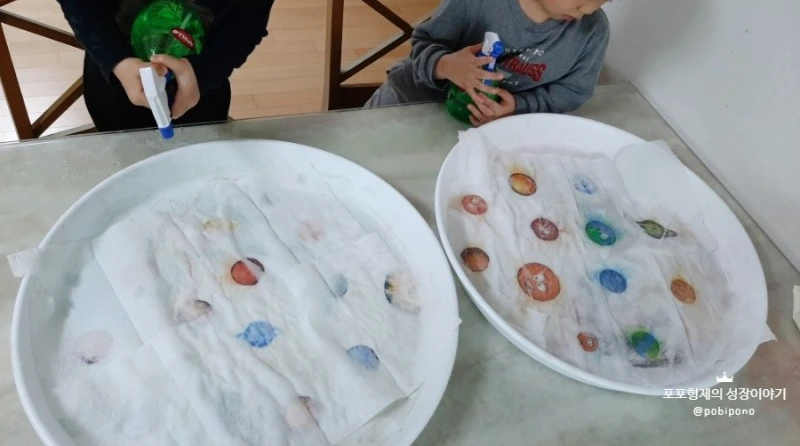 행성그림을 프린트해 트레이에 놓고 위에 키친타월을 덮어준다. 분무기로 뿌리면 행성이 나타난다.