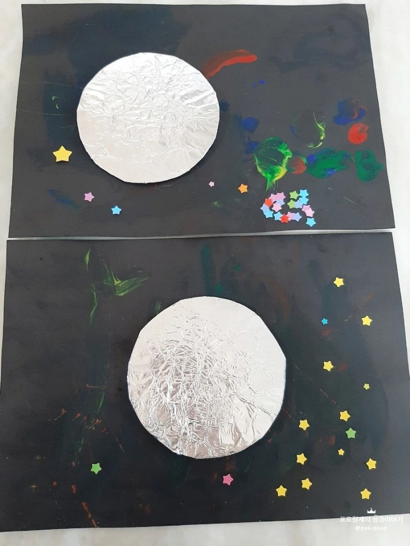 포일을 구겨서 두꺼운 도화지에 씌우면 달의 거칠거칠한 면을 표현할 수가 있다. 금은 도화지에 칫솔과 빗을 이용해 어두운 우주를 표현한 뒤 달을 붙여주었다. 그리고 별스티커를 이용해 마무리로 꾸미도록 하였다.