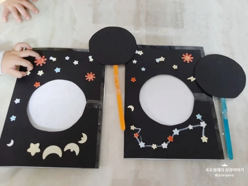 아이 들과 달의 변화도 함께 만들어 볼 수 있다. 검은 도화지에 동그라미를 오려 아이스크림 막대를 붙이면 달이 된다. 그냥 이것만 만들면 심심하니 우주 관련 스티커를 붙여 주어 꾸며주었다. 종이접기를 하든, 그림을 그리든 마지막은 더 그려달라고 하거나 스티커를 붙이게 하여 표현을 확장해 주었다.