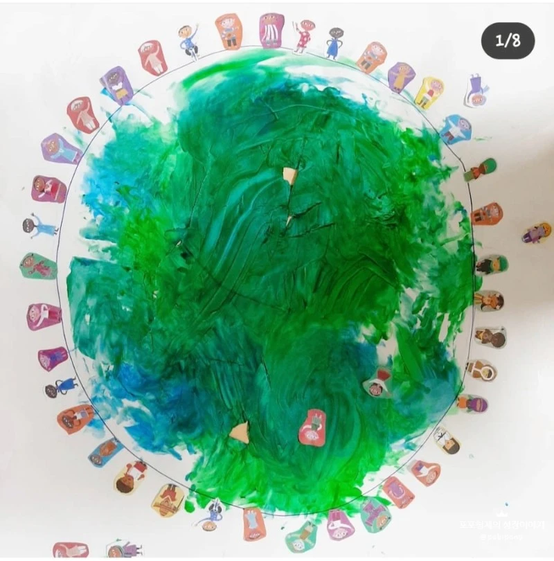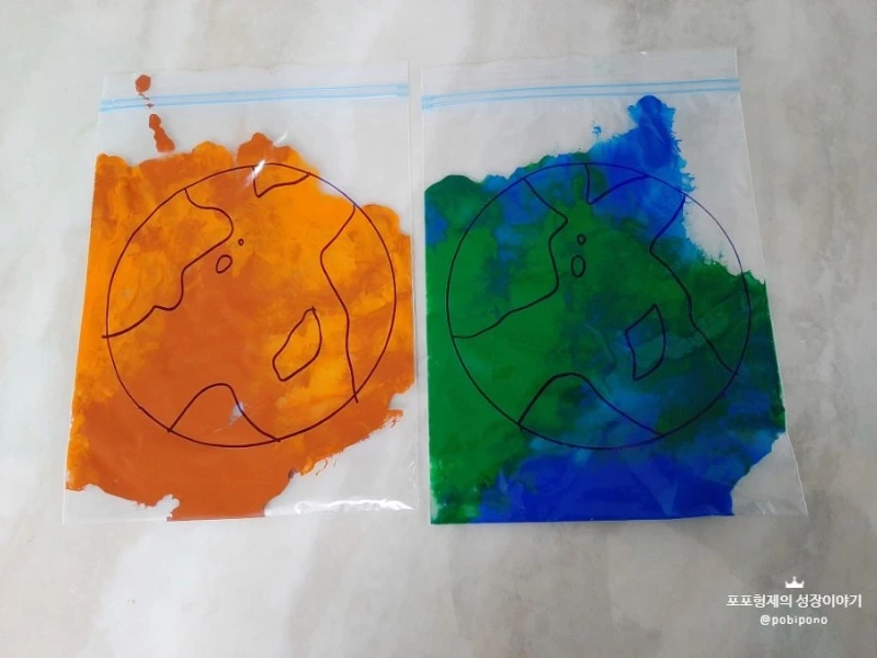 지구를 두 가지 방법으로 표현했었다. 하나는 지퍼백 겉에 지구의 그림을 그려주고 물감을 넣어서 꾸미기를 했다. 건강한 지구와 아픈 지구를 다른 색으로 표현할 수가 있다. 아픈 지구를 보며 슬픈 표정을 나타내는 아이였다. 다음은 전지에 큰 원을 그리고 초록, 파랑 물감을 손에 묻혀 찍어 보았다. 폭풍이 몰아쳤다며 문질러대더니 전지에 구멍이 나버렸다 ㅎㅎ 이렇게만 끝내기 아쉬워 미리 오려둔 여러 나라 친구들을 붙이며 이야기도 해 보았다. 이렇게 활동을 하면서 아이는 공감도 하고 자신의 방식대로 이끌어 가기도 한다.