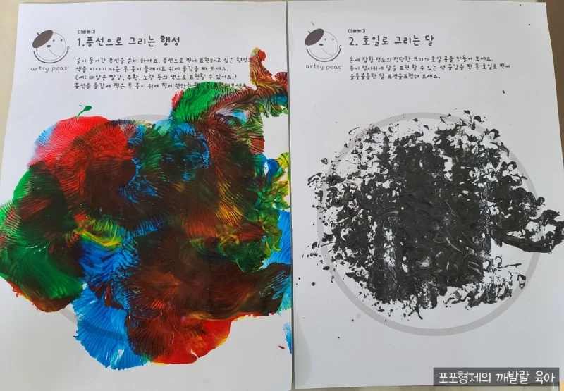 그 예시로 같은 "지구와 우주" 주제이지만 아이와 여러 활동을 했던 기록을 모아보았다. 엄마가 재료만 주면, 또는 활동방법을 언급해 주기만 하면 아이는 자기만의 상상의 나래를 펼쳐나간다. 어떤 때는 아예 다른 방식으로 가기도 하고, 주어진 재료에 자기가 더하기도 하고 빼기도 한다. 또, 지구를 표현하지만 여러 방법으로 표현할 수 있구나도 배운다. 활동을 하는 과정에서, 마치고 나서 자기만의 지식을 활동과 결합시켜 만들어낸다.