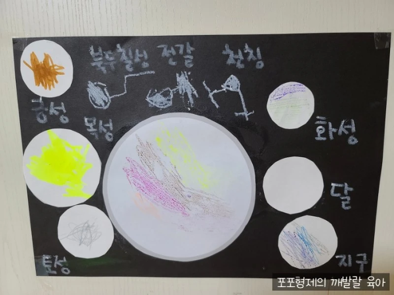 지구와 우주의 책만 읽은 아이와 이런 활동들을 통해 자신의 생각을 나타내고 활동한 아이는 분명 차이가 있을 것이다. 코로나 이후로 참 많은 것들이 변했다. 앞으로 아이가 살아갈 세상은 어떠한 변화가 있을지 모른다. 어떤 상황이 되어도 아이가 적응해서 자기만의 방식으로 살아가기를 원한다면 창의력을 길러주어야 한다고 생각한다. 뇌가 한창 형성되고 있는 이 소중한 시기에 아이에게 다양한 재료와 활동을 제공해 무궁무진한 발달을 이루었으면 좋겠다.